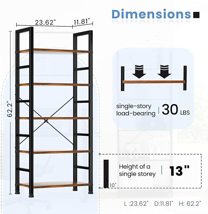 【Space-Saving】This 5-tier narrow bookshelf maximizes storage without taking up much floor space, ideal for organizing books, decorations, tools, and more.